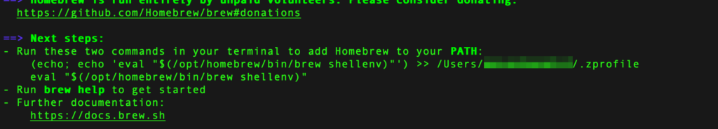 (echo; echo 'eval "$(/opt/homebrew/bin/brew shellenv)"') >> /Users/ユーザー名/.zprofile