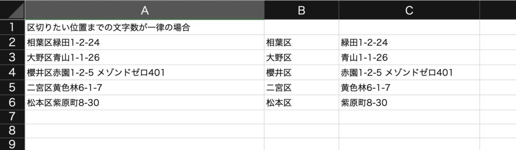 上のキャプチャーような、区切りたい位置が「区」でその文字数が3文字で統一されている場合、LEFT関数を使い、文字列の先頭から文字数(この場合3)を指定します。